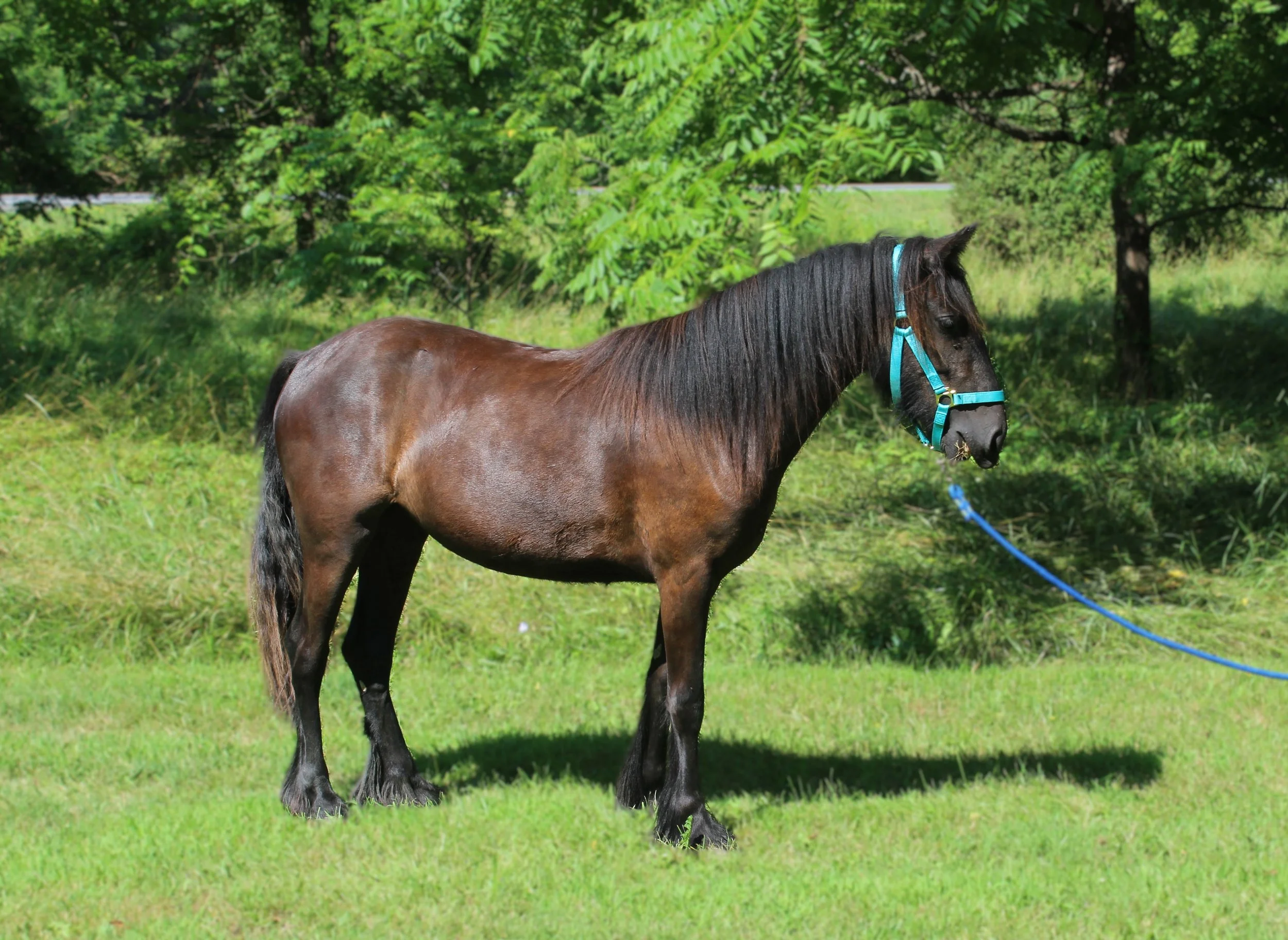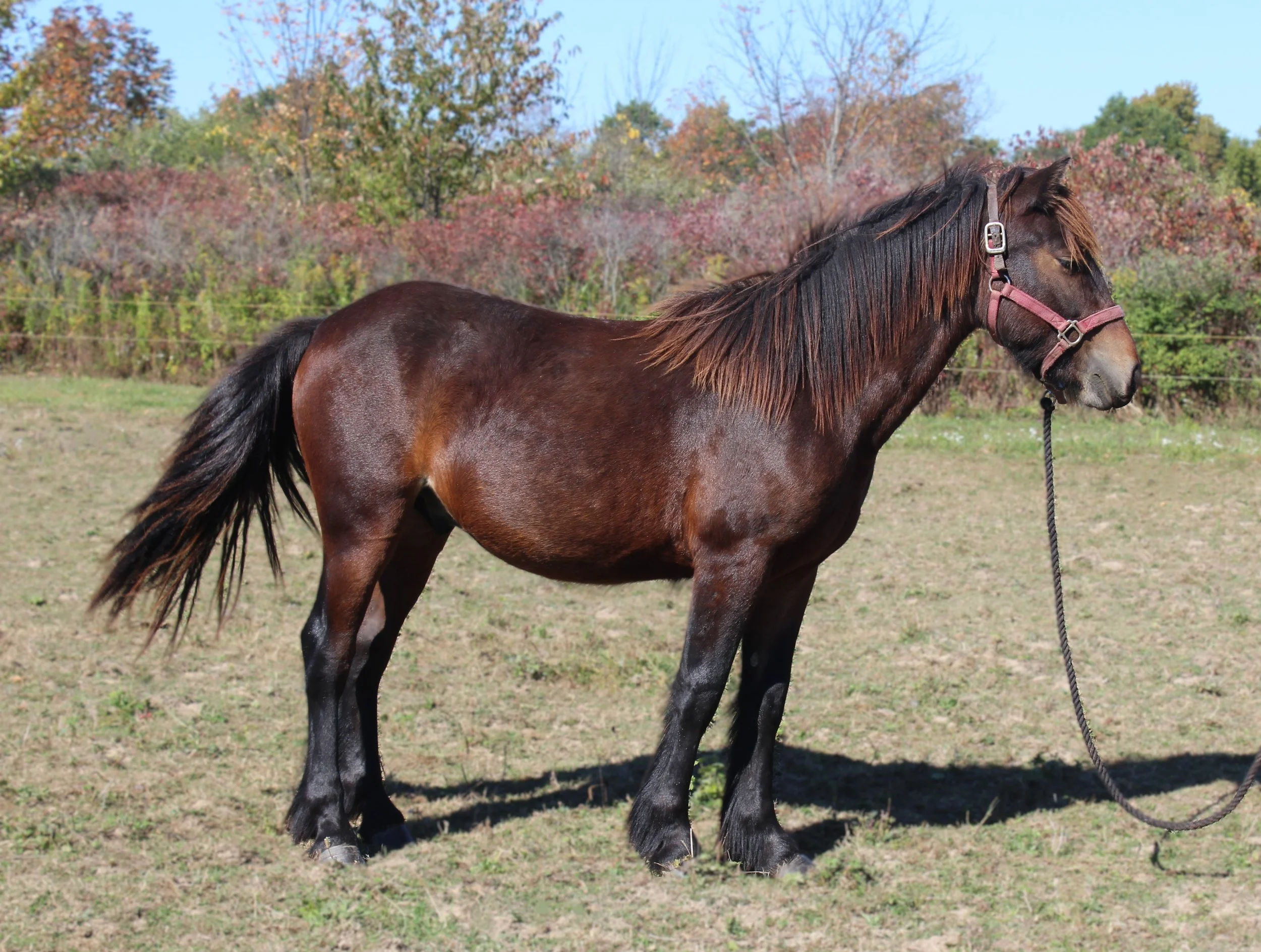 Blackshadow Lunar Eclipse aka "Luca" is named for the eclipse like marking on his forehead. Available in upstate New York, he is the perfect example of a purebred Dales pony and is sired by imported Dales pony stallion Kingmaker Jupiter. His dam is none other than our Redprairie Violet, who is the very epitome of what a Dales pony should be. Violet consistently represents her breed by embossing all of her foals with nothing short of excellence. Her firstborn, bay gelding Lagniappe Aristocrat, represents the Dales pony breed at the Kentucky Horse Park. She is also dam to the gorgeous licensed Dales pony stallion Blackshadow Apparition. Both sire and dam have passed on their exceptional conformation and temperaments to Luca - he's got it all.